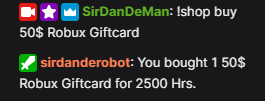 To redeem an item do the command !shop buy <ITEM>. I chose the 50$ Robux Giftcard.